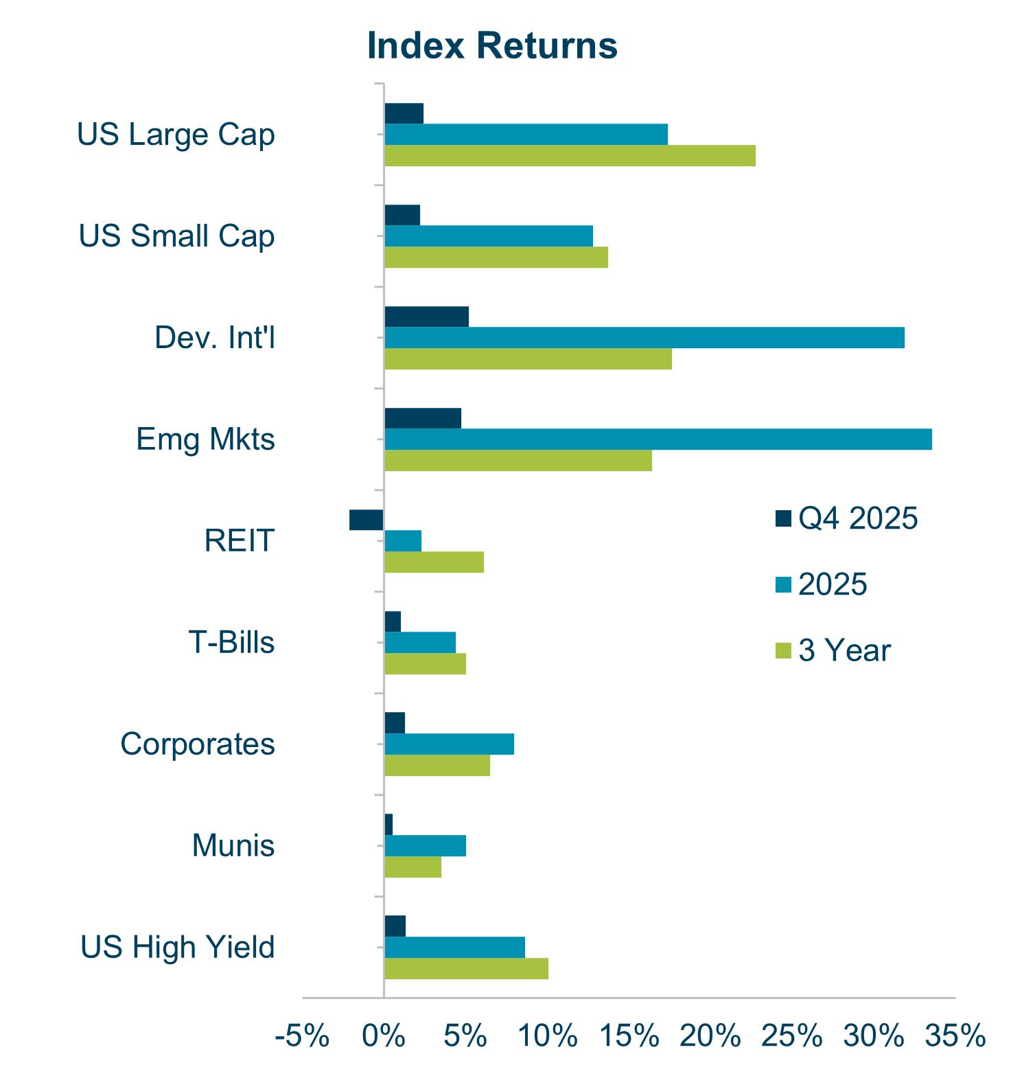 Global equities capped a strong 2025 with positive Q4 gains, driving major indices to record highs. International and Emerging markets continued to outperform the US markets in Q4 resulting in significant outperformance for the full year for the first time in recent years. This was driven by AI-related technology companies in South Korea and Taiwan, attractive valuations in emerging markets, improving global growth, and the weakening dollar. US stocks reached record highs in Q4, but momentum cooled due to AI jitters.