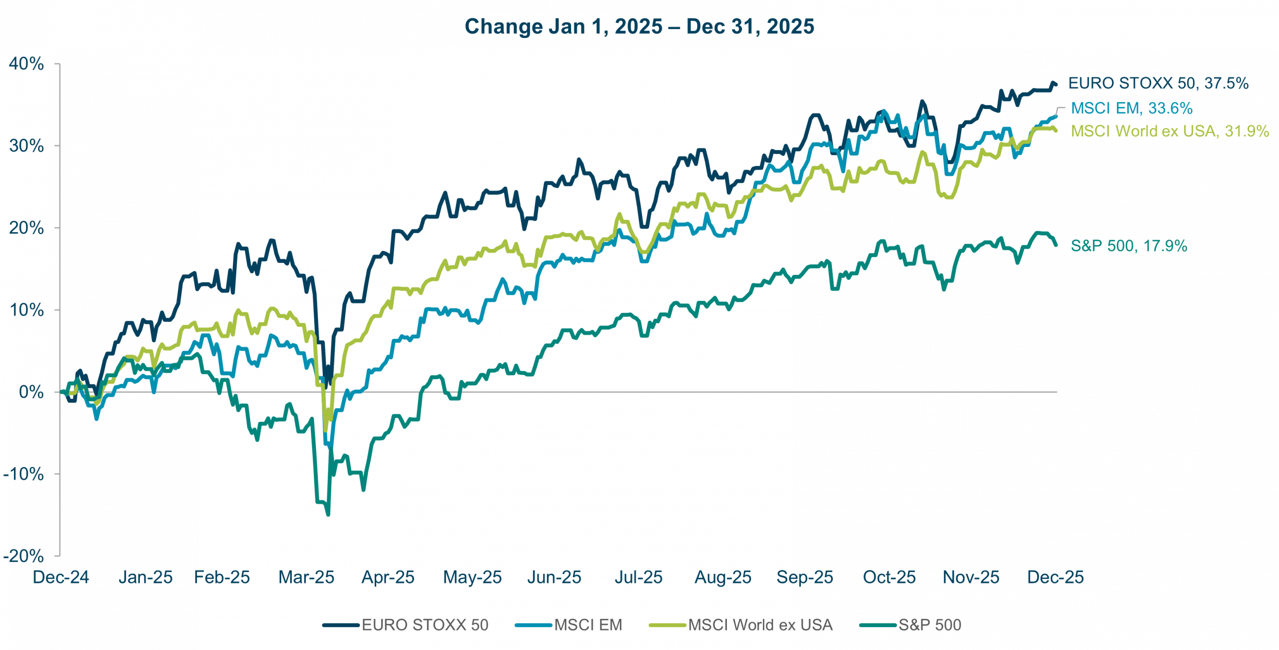 Chart comparing Euro Stoxx 50, MSCI EM, MSCI World ex USA, S&P 500 between 12/24 and 12/25.19
