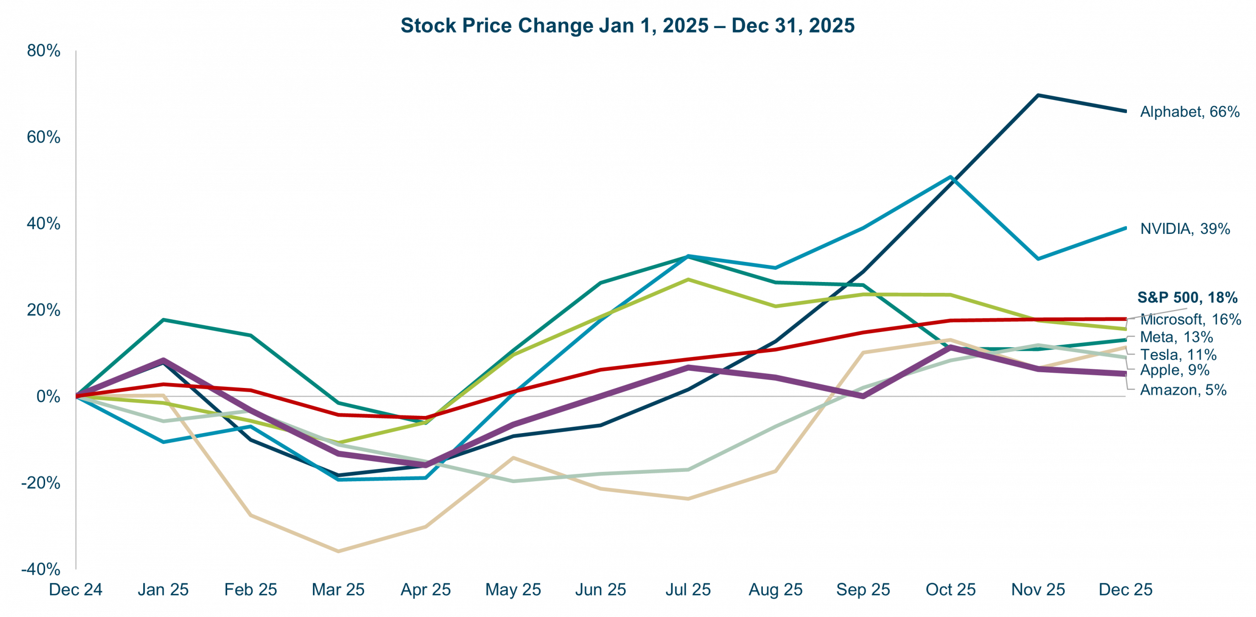 Chart: Stock Price Change comparing Alphabet, NVIDIA, S&P 500, Microsoft, Meta, Tesla, Apple, Amazon between Jan 1, 2025 and Dec 31, 2025 22