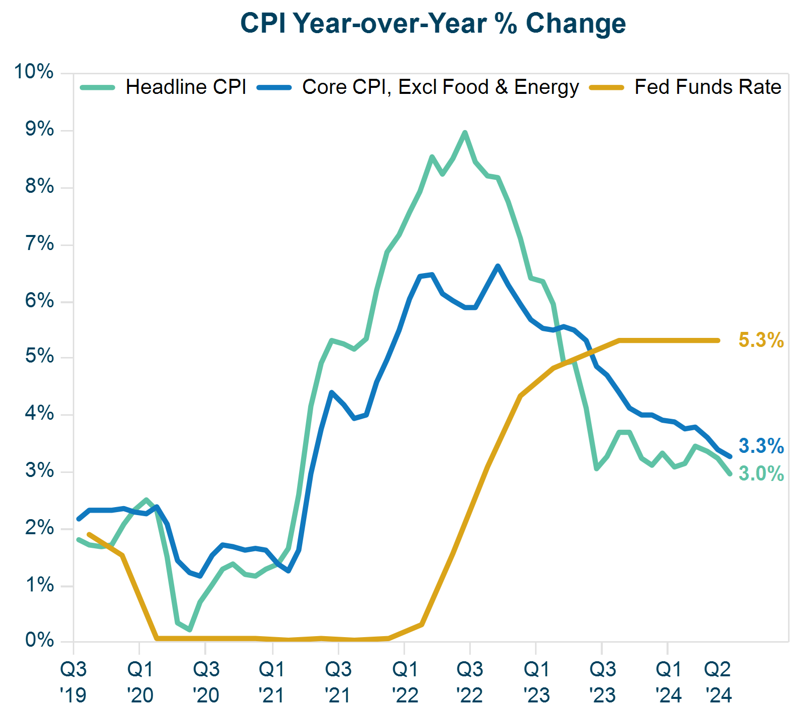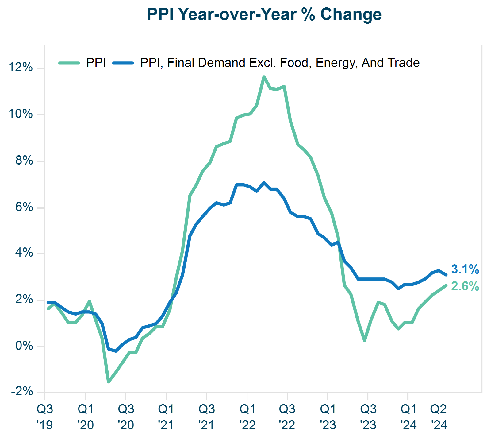 The disinflationary trend continues as headline inflation edged down to 3.0% year-over-year from 3.5% in March. Core CPI also continues to trend downward at 3.3% with the lowest reading since April 2021. Shelter costs were a notable factor in the slowdown in inflation, registering the smallest rise since 2001. While inflation remains above the Fed’s 2% target, recent inflation readings have bolstered expectations that the Fed is on a path for the first rate cut in September. However, the Producer Price Index (PPI), a leading indicator of consumer price inflation, climbed in June slightly more than forecast, suggesting inflation pressures remain and the Fed continues to be data dependent before cutting rates.
