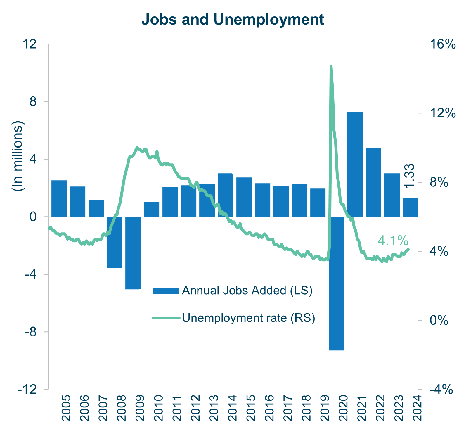 Along with volatility stemming from the concentration of market returns from a very small number of stocks, markets over the last year have reacted to expectations of actions by the Federal Reserve that have not come to be. At the end of 2023 market consensus was that the Fed would reduce interest rates 3 times in 2024.⁹ Meetings in the first half of the year came and went with no rate cuts and little signaling by the Fed of imminent rate cuts as inflation remains above the Fed’s target and the labor market remains strong despite some softening. As we examine market volatility and what may lie in the months ahead, it may help us to understand more about economic indicators and their relationship to market expectation. In looking at the economy and its relationship to market volatility, there are three economic indicators we want to understand: