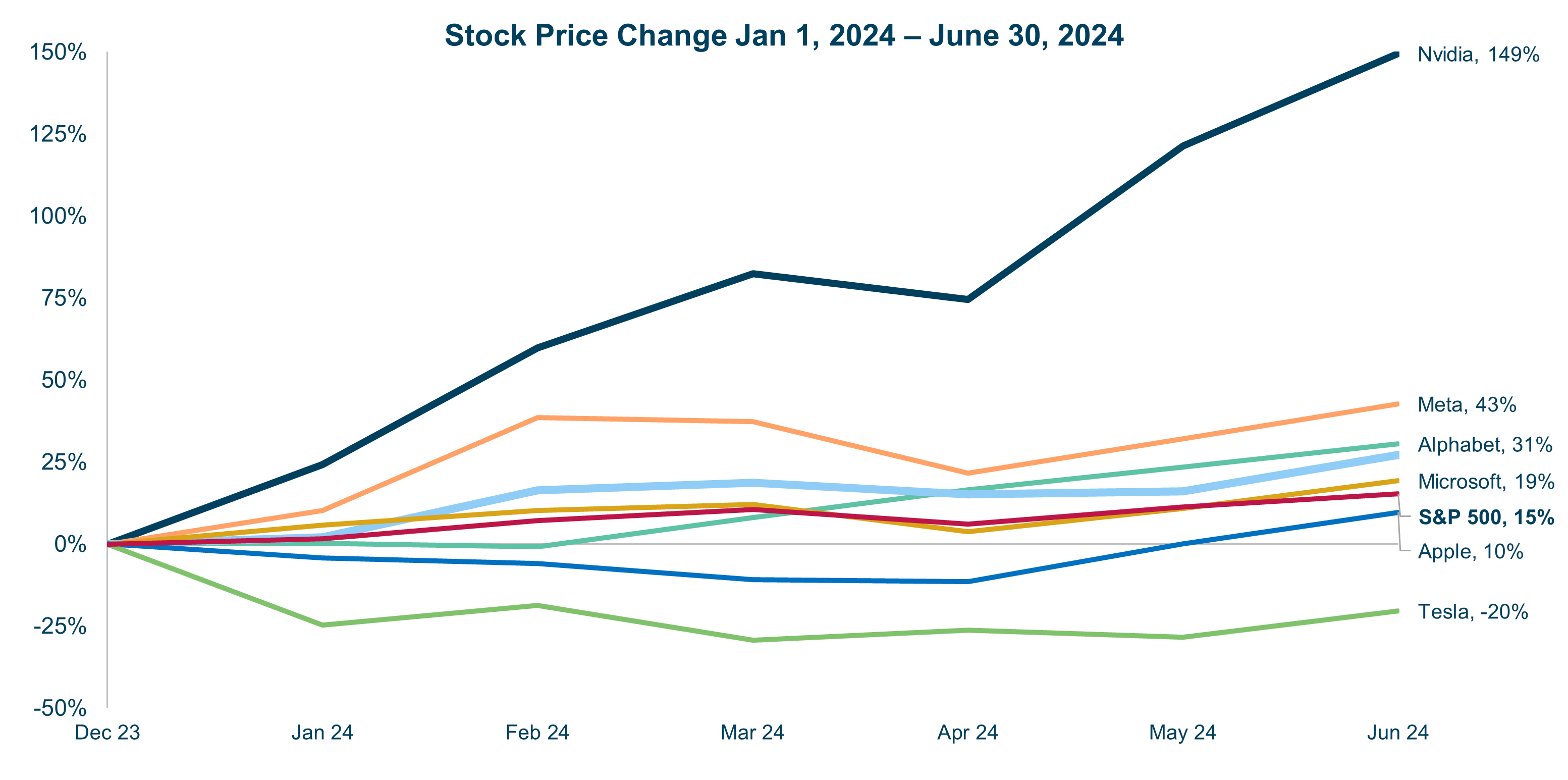 Seven US large-cap companies – Microsoft, Apple, Nvidia, Meta, Amazon, Tesla, and Alphabet – were responsible for more than half of the gains in 2023 but are more dispersed in 2024, with Nvidia and Meta leading and Tesla and Apple lagging. Despite that, the “Magnificent Seven” represented ~32% of the S&P 500 Index weight and accounted for ~61% of the S&P 500 Index YTD returns. Nvidia rose ~150% contributing to 30% of the gains in the S&P 500 in 2024. Actively managed portfolios without exposure to these companies, particularly Nvidia, have trailed their benchmarks in recent years and concentration risk is severely elevated in passively managed portfolios with exposure to the Magnificent Seven.